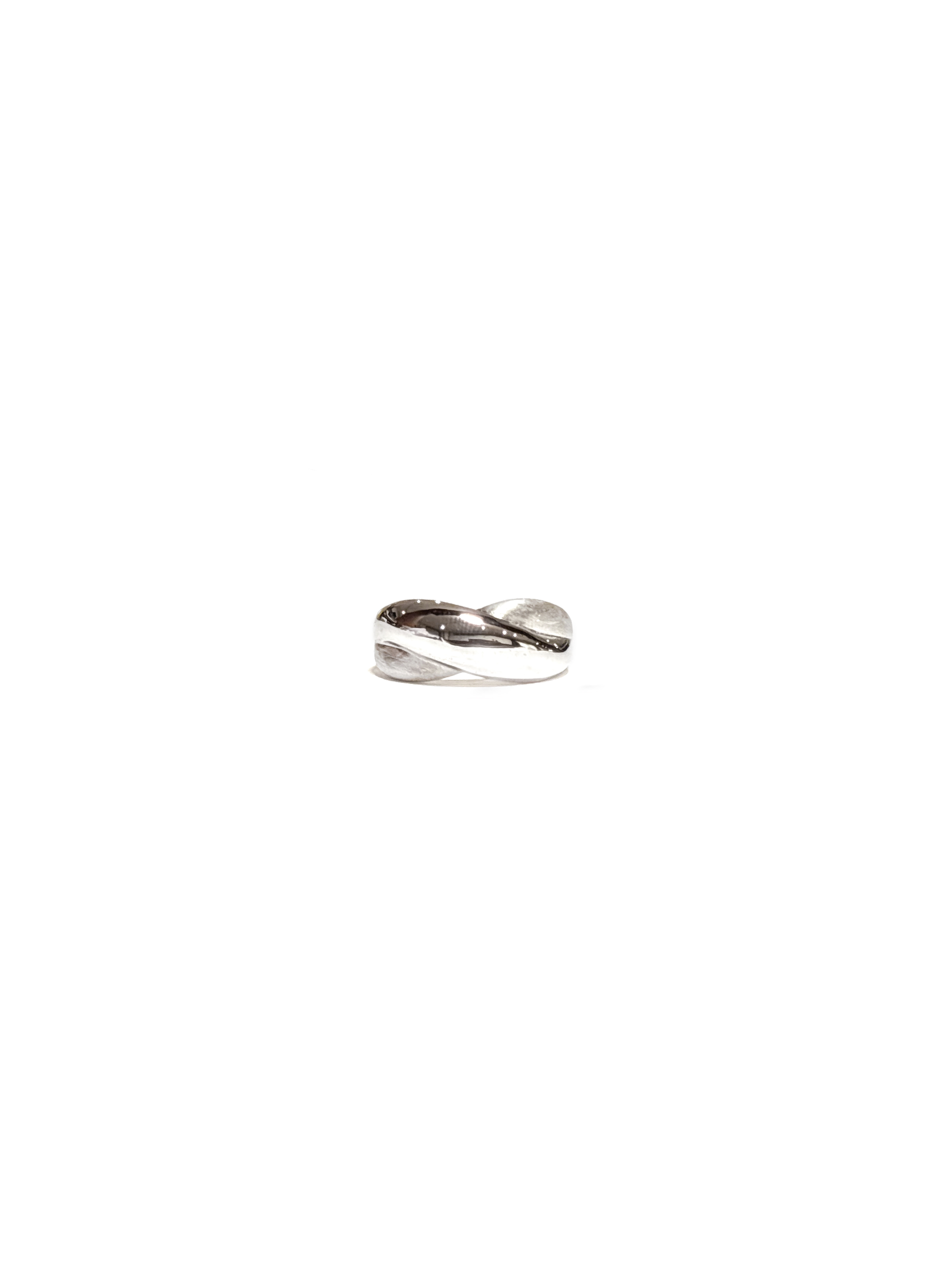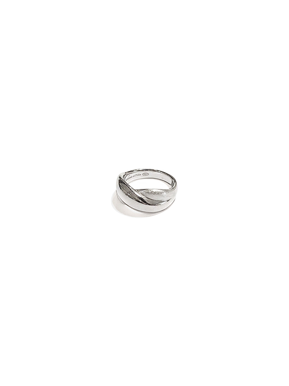 유광과 무광이 교차하며 X 형태로 엮인 실버 링으로 서로 다른 텍스처가 만들어내는 대비가 볼륨감 있는 실루엣 속에서 은은한 깊이를 더해줍니다.