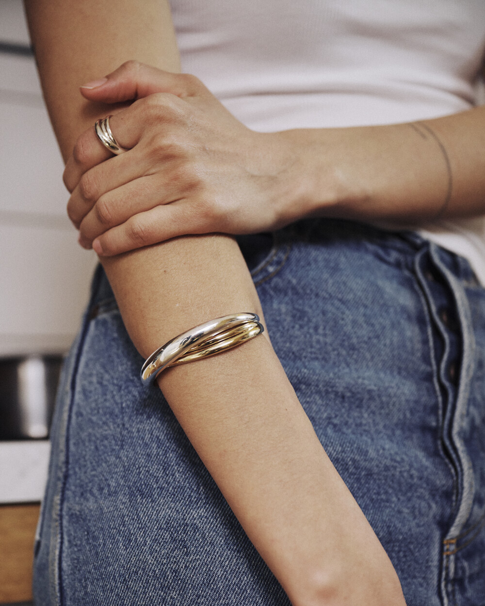 세 개의 실버 라인이 자연스럽게 교차하며 이어지는 링입니다.