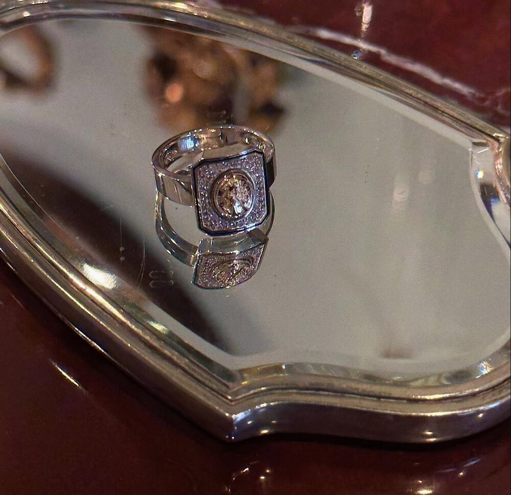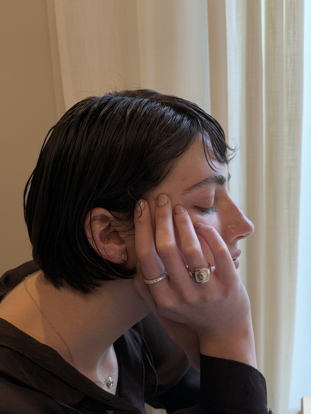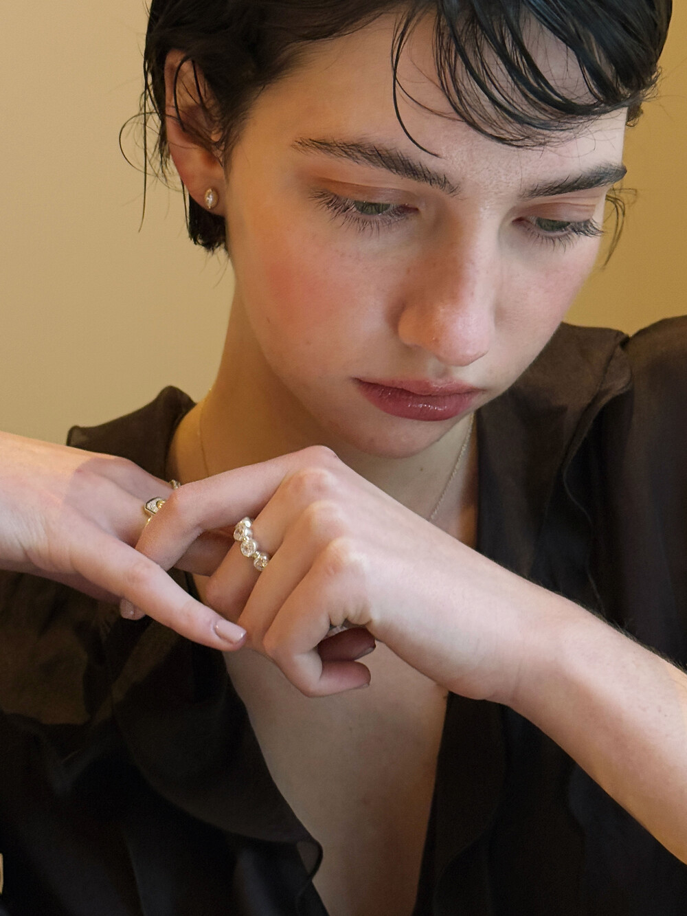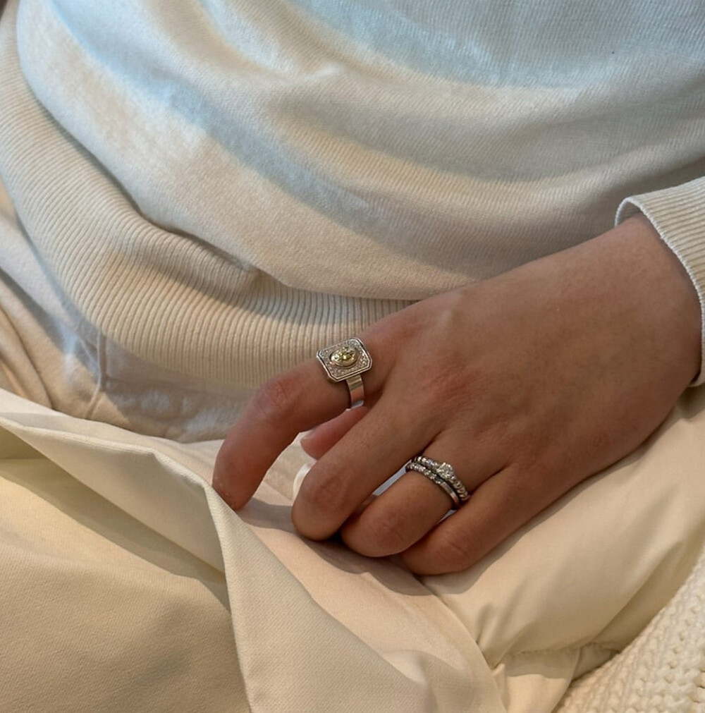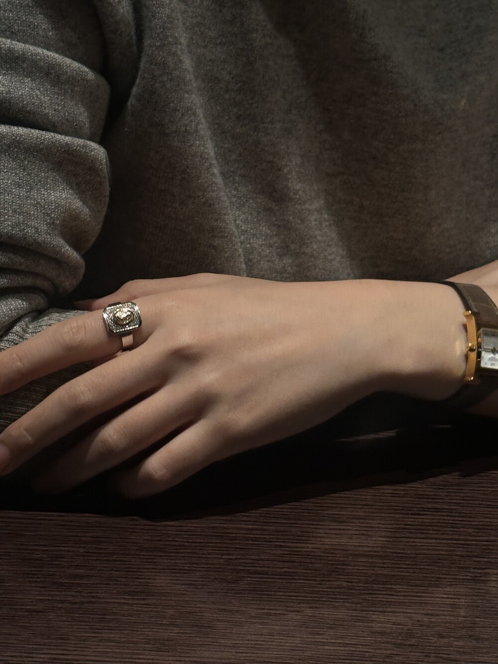 14K 옐로우 골드로 제작된 여인 형상의 펜던트와 실버 밴드가 조화를 이루며, 블랙 에나멜과 화이트 지르코니아의 색상 대비가 돋보이는 링입니다. 중앙 메인 디자인은 화이트 큐빅 지르코니아의 파베 세팅으로 더욱 빛나며, 모던하면서도 우아한 쉐입이 강렬한 포인트를 완성합니다. 감각적인 디테일과 고급스러운 색감이 어우러져 독창적이면서도 빈티지한 매력을 선사합니다.