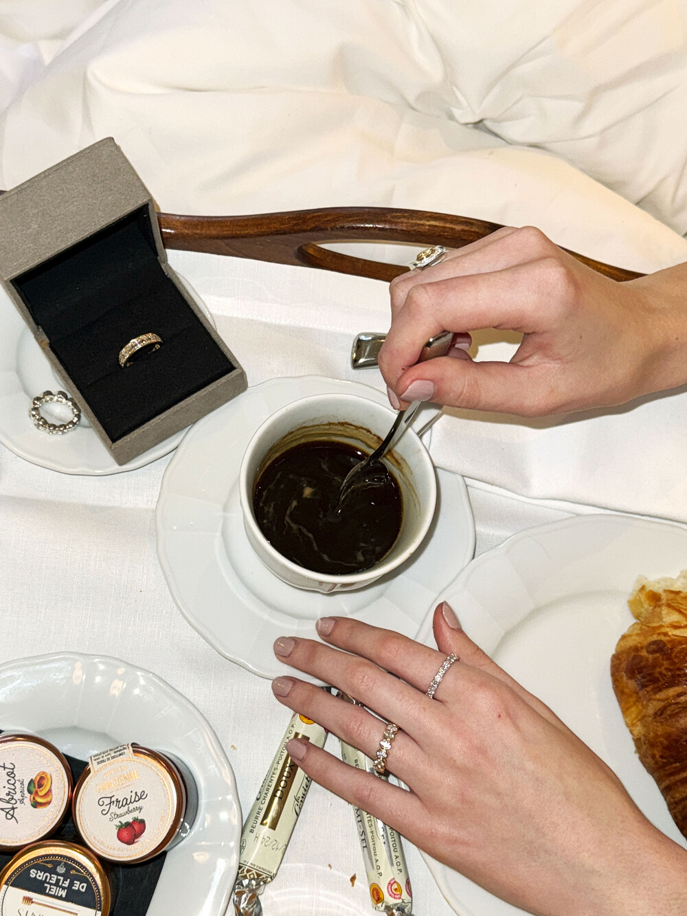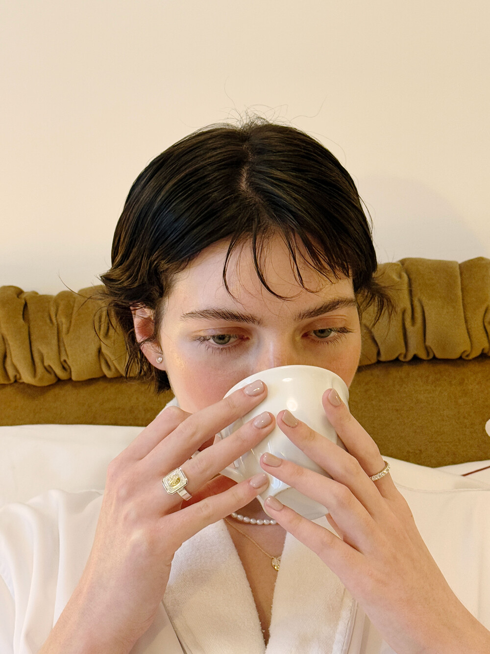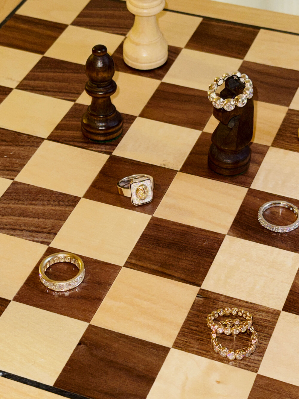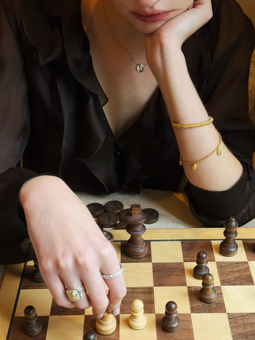 14K 옐로우 골드로 제작된 여인 형상의 펜던트와 실버 밴드가 조화를 이루며, 블랙 에나멜과 화이트 지르코니아의 색상 대비가 돋보이는 링입니다. 중앙 메인 디자인은 화이트 큐빅 지르코니아의 파베 세팅으로 더욱 빛나며, 모던하면서도 우아한 쉐입이 강렬한 포인트를 완성합니다. 감각적인 디테일과 고급스러운 색감이 어우러져 독창적이면서도 빈티지한 매력을 선사합니다.