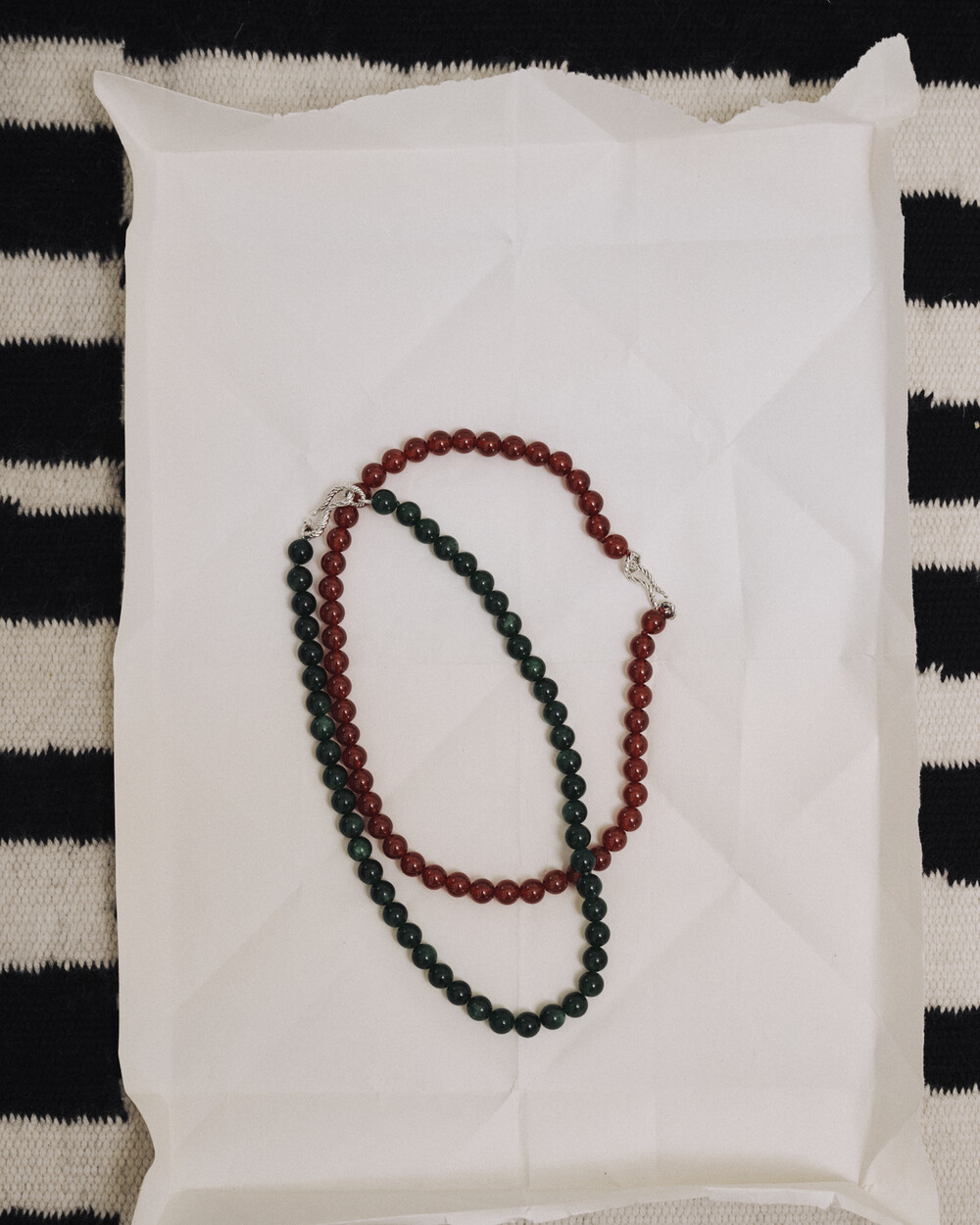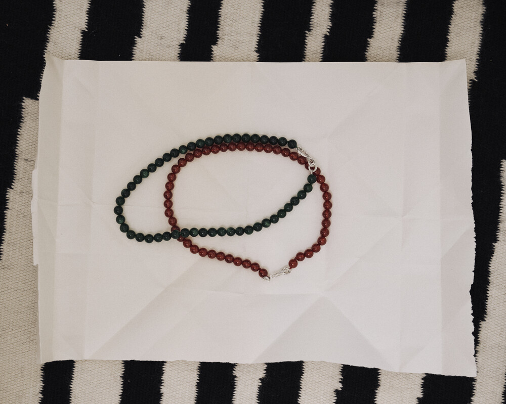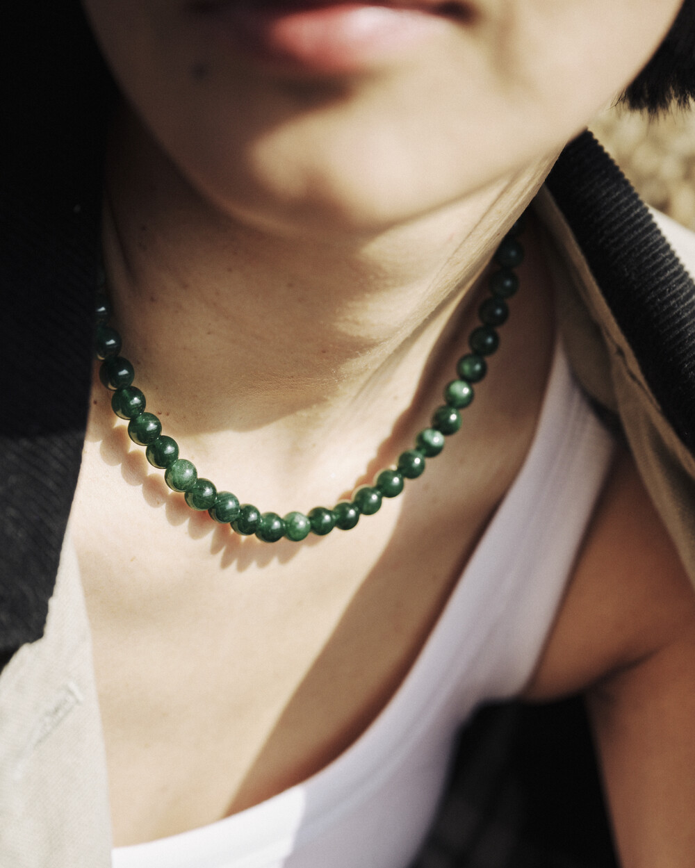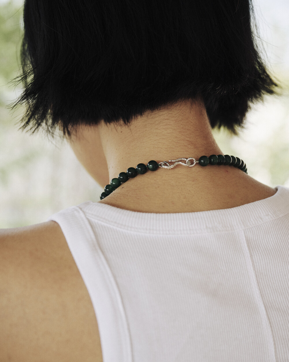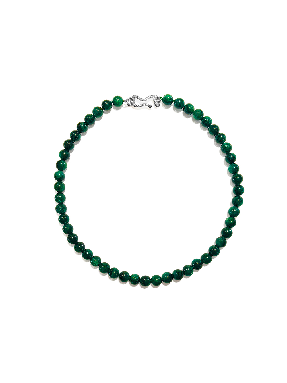 매력적인 그린 톤의 에메랄드가 부드럽게 이어지는 비드 네크리스입니다.