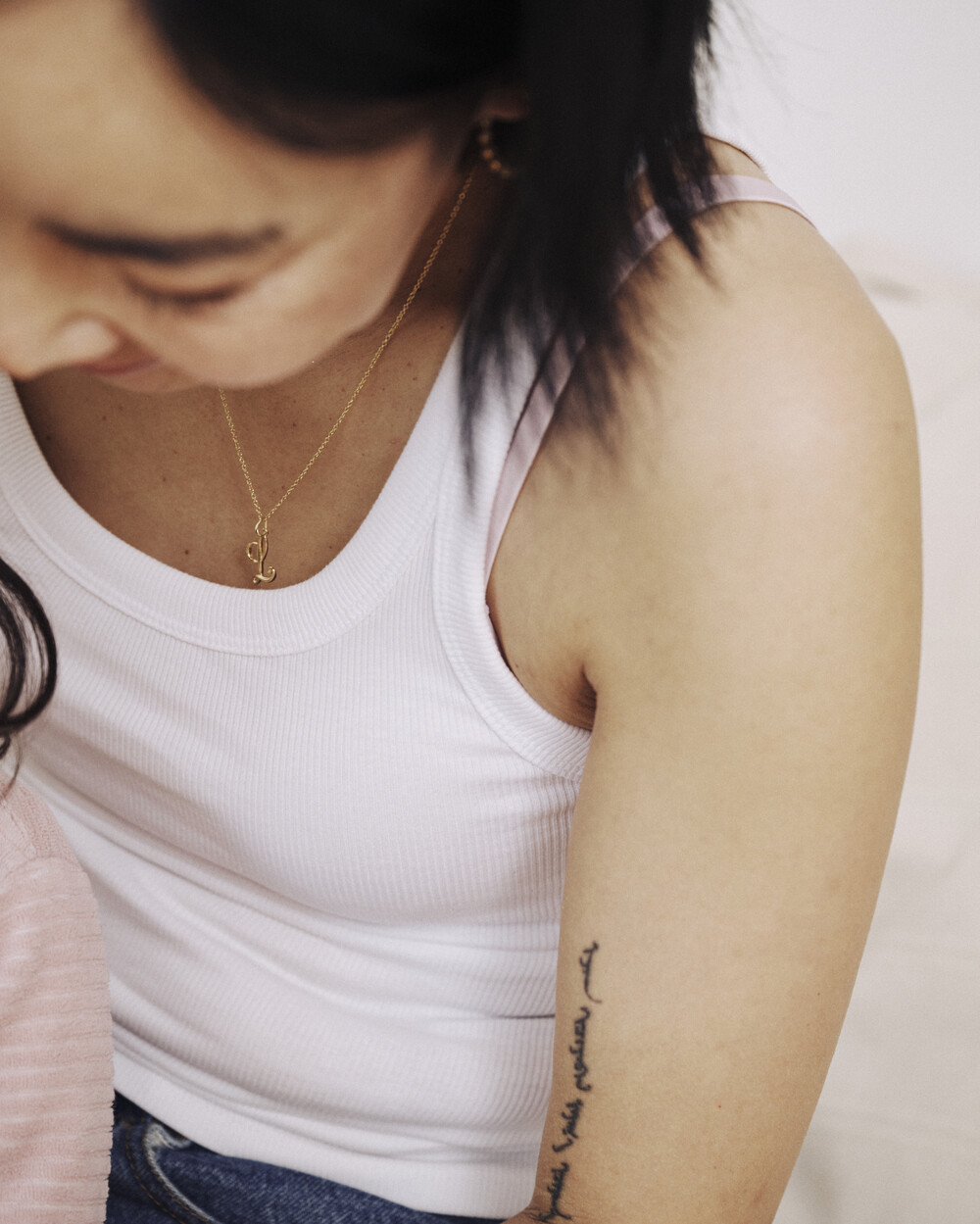 유려하게 흐르는 필기체 라인을 담아낸 14K 이니셜 펜던트입니다.